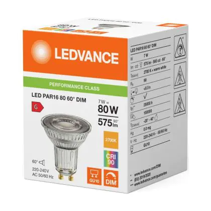 Puoi risparmiare fino al 90% tra il risparmio di energia e I costi di mantenimento grazie al basso consume di soli 7W e la lunga vita media utile di 25000 ore, comparandola invece con una lampada alogena GU10 con la sola durata di 2.000 ore. Inoltre le lampade LED non producono raggi IR e raggi UV dannosi per noi esseri umani tutto questo senza neanche produrre calore! Installarla è veramente semplice: ruotare la vecchia lampada GU10 di un quarto e rimuoverla dall’attacco. Successivamente inserire la lampada LED GU10 nell’attacco e girarla di un quarto per installarla. Questa è lampada di alta qualità Ledvance e parte da un prezzo di . Puoi usare questo prodotto come desideri grazie alla nostra garanzia totale di3 anni da Lampadadiretta.it.