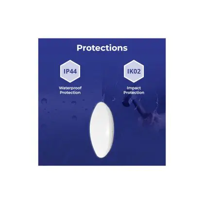 Un elemento importante delle plafoniere e delle applique LED è il loro livello di proezione IP, che indica la protezione contro l'ingresso di polvere e umidità/acqua. A partire da IP65, un apparecchio di illuminazione è a prova di polvere e acqua. Il valore IP di questa plafoniera LED è: IP44. Stai cercando una plafoniera LED per esterni? Allora presta attenzione alla protezione da urti e impatti, ovvero il valore IK, che per questa lampada è IK02 - 0.20 Joule.