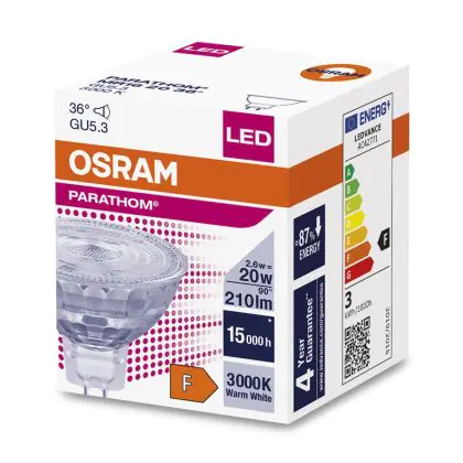 La Osram Parathom Faretti LED GU5.3 MR16 3W 230lm 36D - 830 Luce Calda | Sostitutiva 20W è perfetta per la sostituzione della classica lamapda alogena20W GU5.3 con colore della luce 830 Luce Calda. Questa lampadina ha una forma Spot con un diametro di 50mm. La distanza tra I due pins è di 5.3mm. Queste lampade hanno bisogno di un trasformatore poiché operano a 12V. I trasformatori possono essere trovati in "Accessori" su questa pagina. Qual’è il trasformatore adatto? Dipende dal numero di lampade che si vuole installare. Il nostro servizio di vendita e assistenzati ti aiutera nella scelta. Passare a LED offre molti vantaggi!