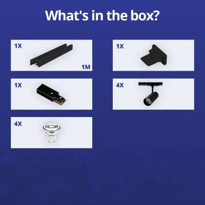 Descrizione Set completo 1-Fase Rail 1 Metro Nero | incl. 4x Faretti + GU10 2700K 3W Dimmerabile + Tappo Di Chiusura, Connettore di Alimentazione